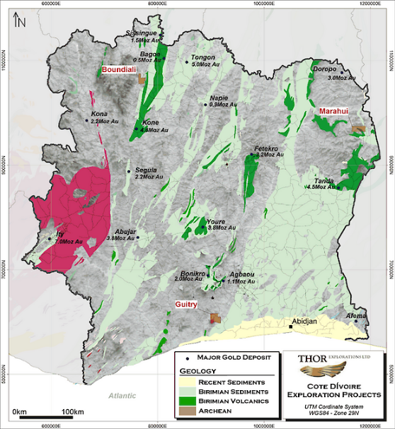 The Guitry Project is located 220km west of the capital Abidjan comprises two contiguous exploration permits that cover a total of 773km2. The permits encompass rocks belonging to the Tehini Greenstone Belt, which extends northwards into Burkina Faso where it hosts large gold deposits such as Houndé (5.2Moz) and Mana (2.3Moz). Early-stage exploration completed by the previous licenceholder, prior to Thor’s acquisition, includes 7,672 soil