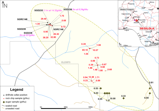 High grade intersects including 10 ounces of gold per ton at near-mine exploration area 15km west of Segilola