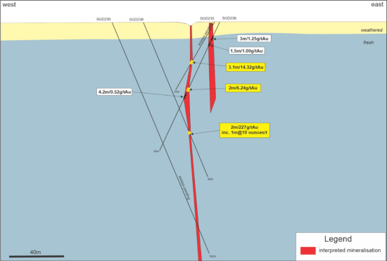 Consistent high-grade intersections have been obtained to a vertical distance of 75m from surface (Figure 2). In hole SGD236, a parallel mineralised zone has been intersected about 10m to the east of the main vein. This suggests that additional mineral potential in the footwall and hangingwall rocks to the main vein. Ongoing drilling will test both the strike length and depth potential of this system.