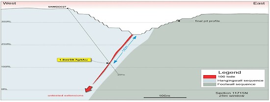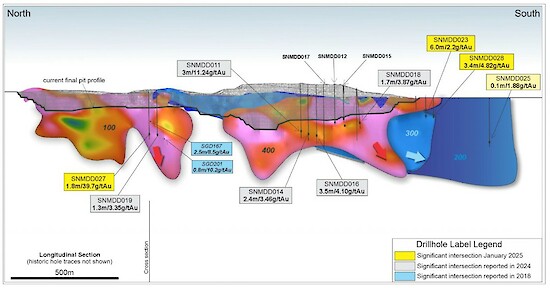 Holes SNMDD019 and SNMDD027 were drilled to follow up several holes that were completed in 2018 that were designed to test the depth extensions of the 100 lode. Results from these holes include 1m grading 10.2g/tAu in SGD201 and 2.5m grading 8.5g/tAu in SGD167 (Figure 1).